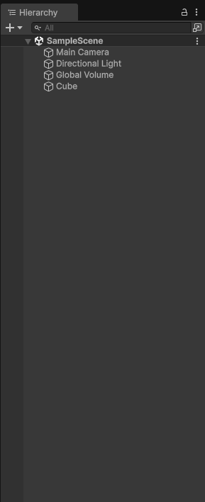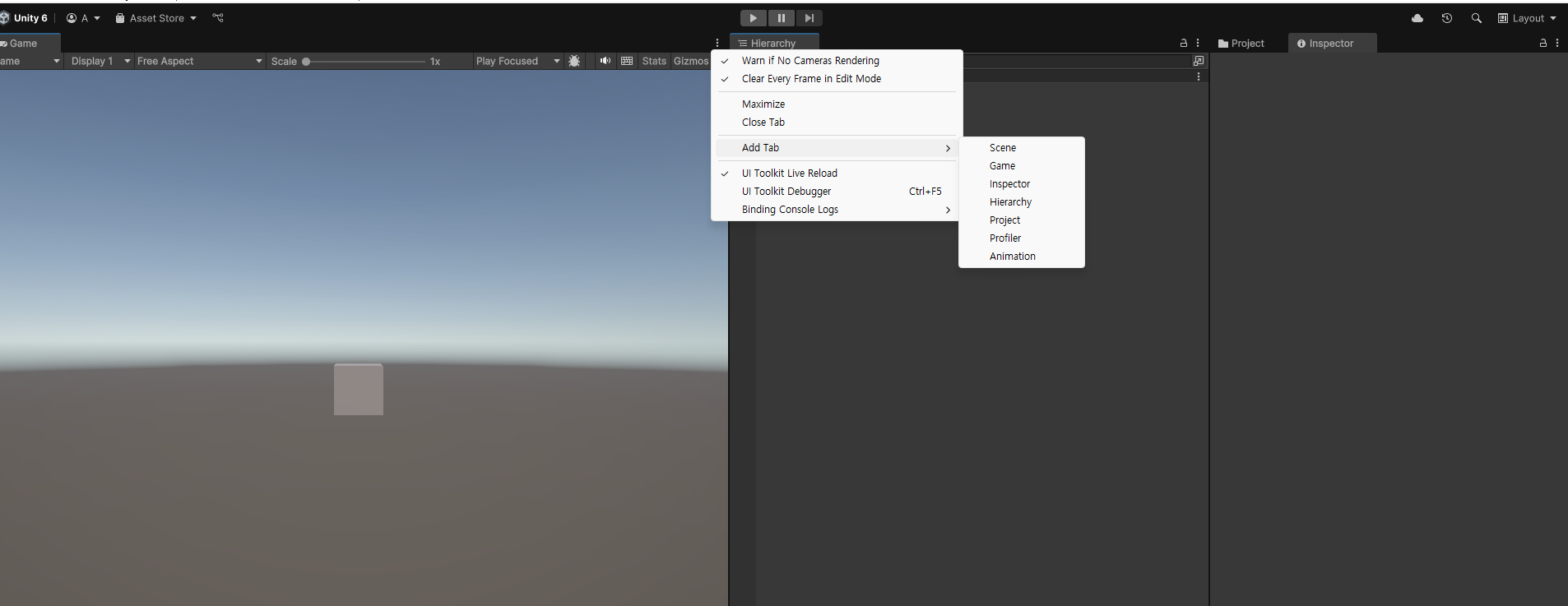 하이어라키에서는 새로운 오브젝트를 추가하거나 삭제 그룹화를 할 수 있습니다. 위에 창에서 보면 예시로 큐브를 하나 만들어놨기 때문에 하이어라키 창에 큐브가 있는 걸 볼 수 있습니다.