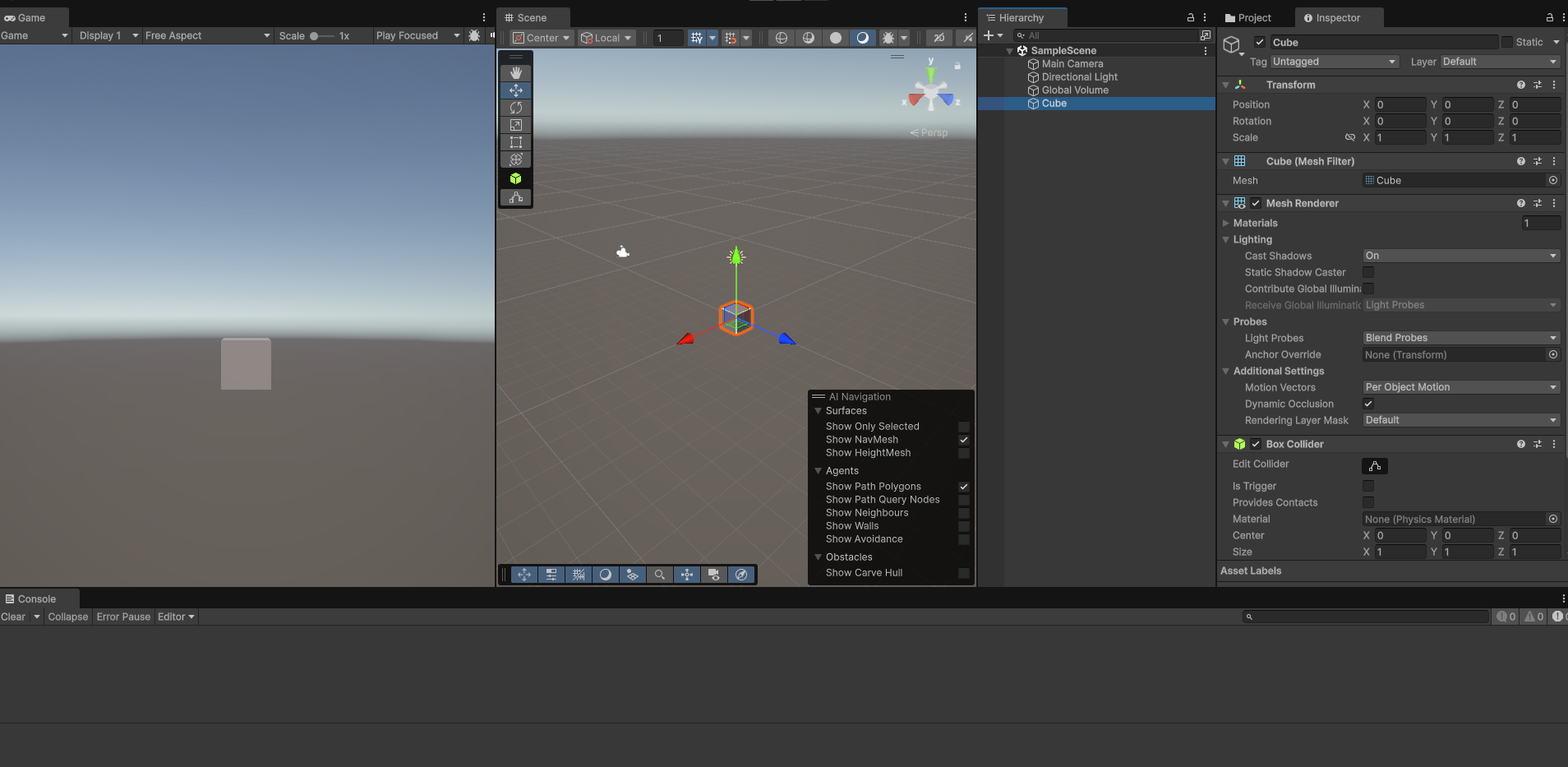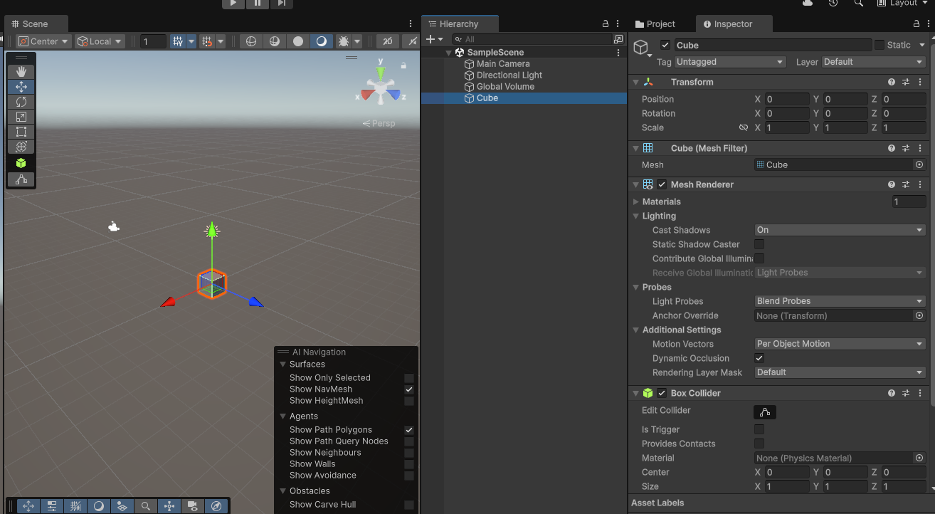 Inspector 창에 있는 항목을 간단하게 살펴보면 Transform 큐브의 위치를 변경하거나 회전시키고 크기를 키우거나 줄일 수 있습니다.