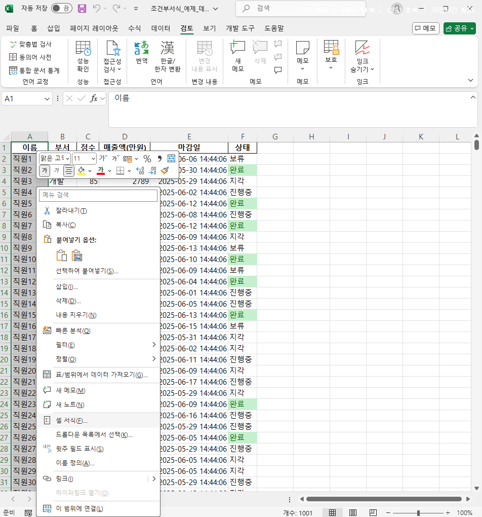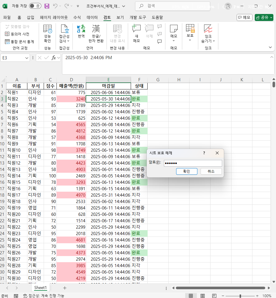 마지막으로 우리가 직전에 했던 '시트 보호'를 가용하면 선택한 셀만 잠금이 됩니다.
