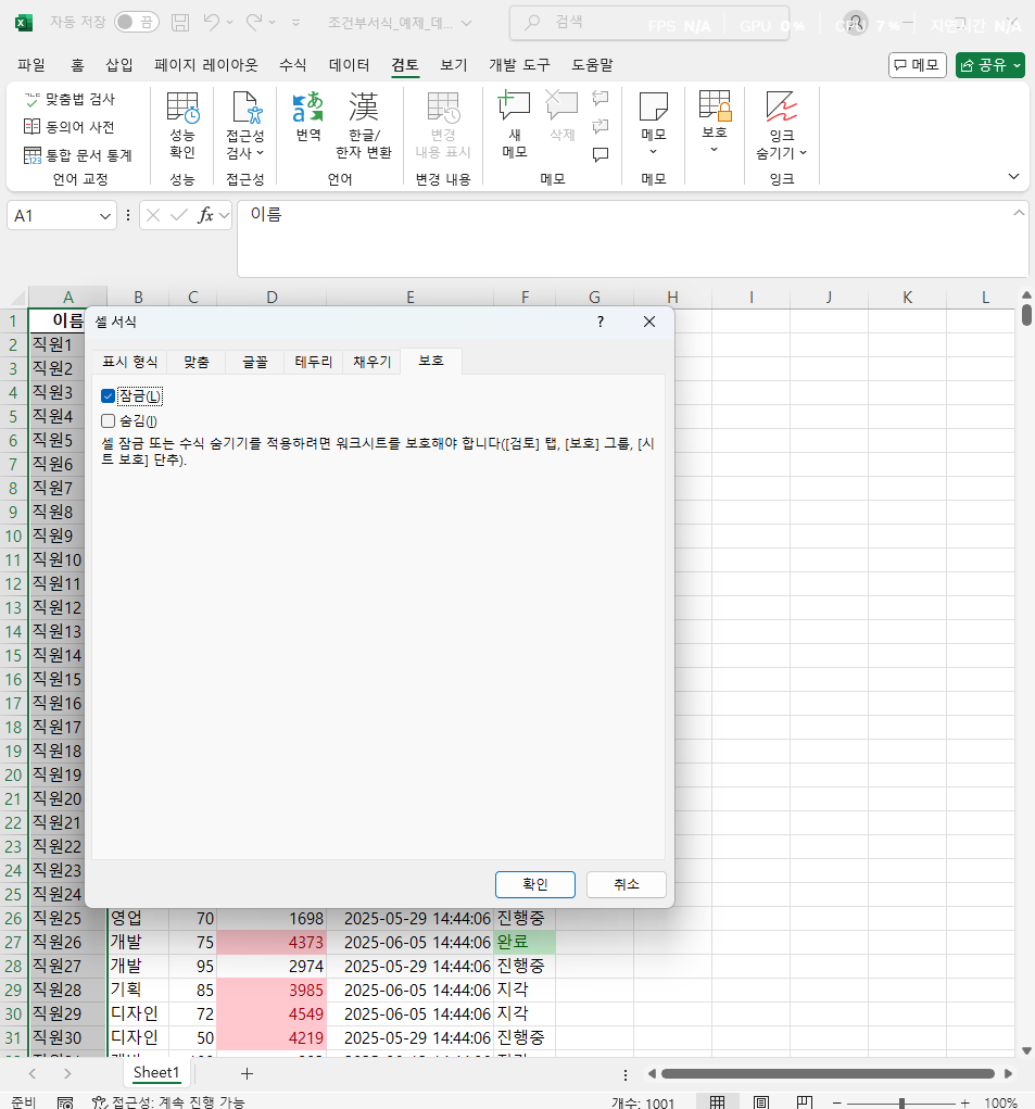 마지막으로 우리가 직전에 했던 '시트 보호'를 가용하면 선택한 셀만 잠금이 됩니다.