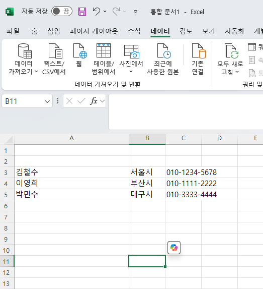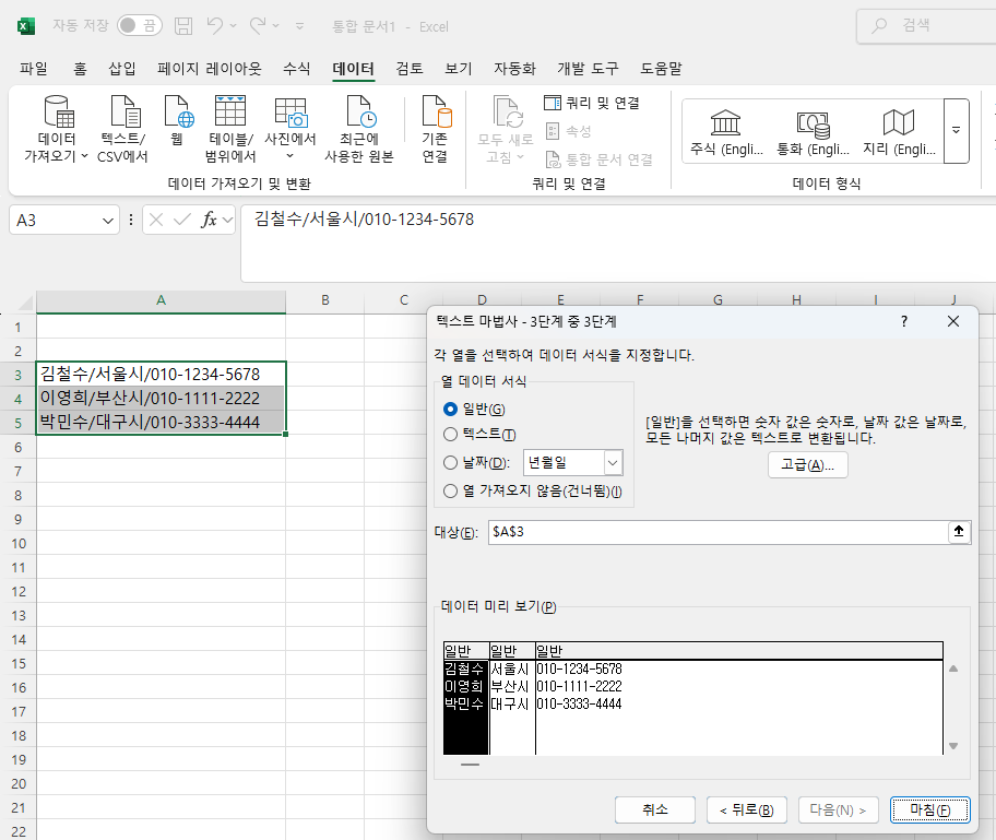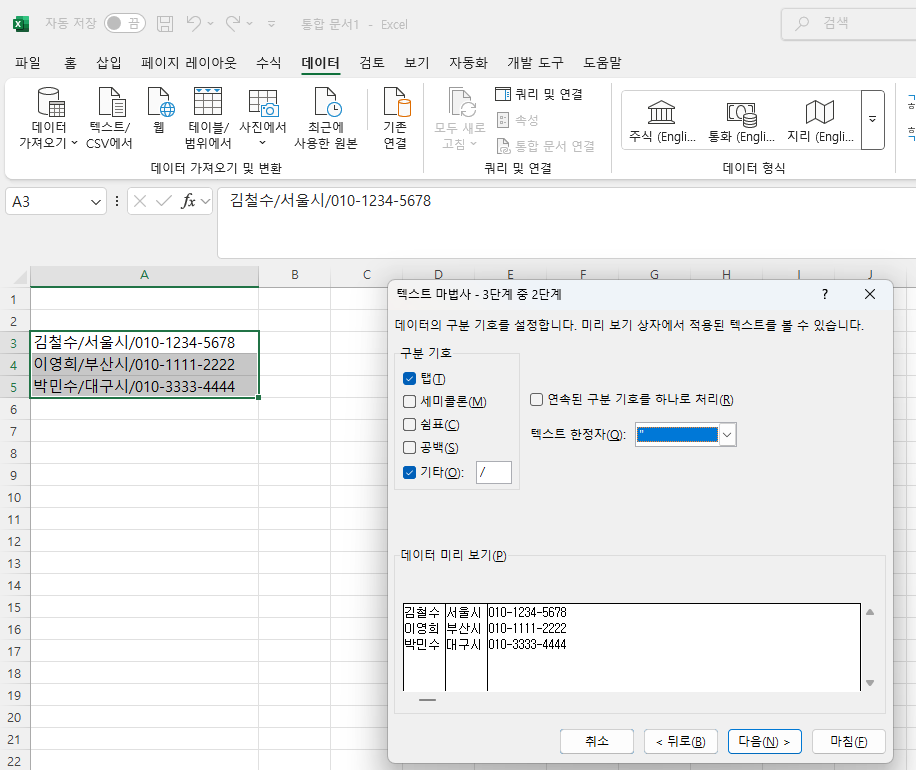 엑셀에서 주소, 이름, 연락처를 나눠보기