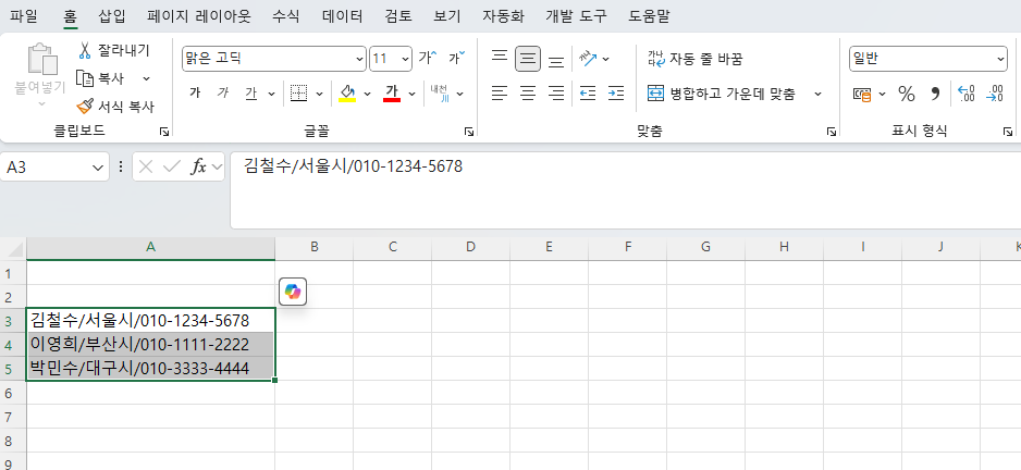 1. 고객 ㅁ여단 처럼 이름/주소/연락처 모든 정보가 한 셀에 있는 경우