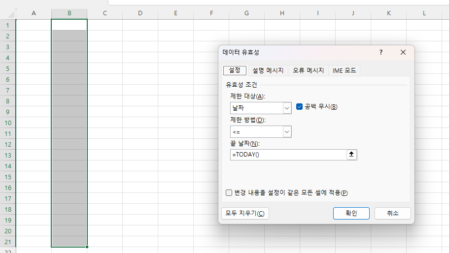 자 이렇게 범위를 정하고 유효성 설정도 했습니다. =TODAY()는 오늘 날짜를 자동으로 가져오는 함수입니다.