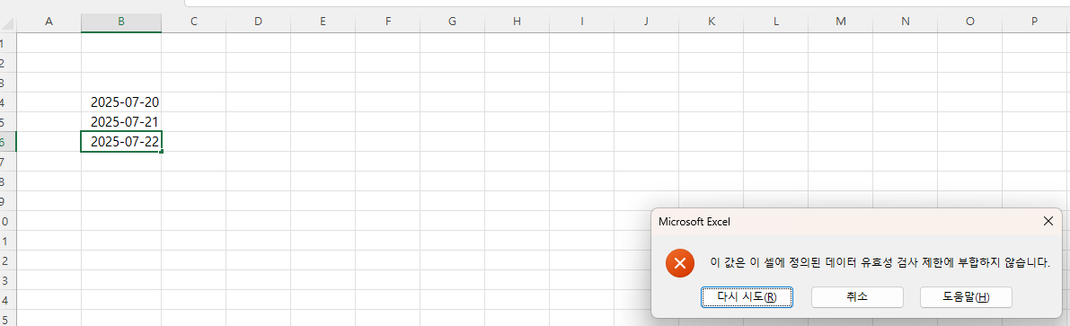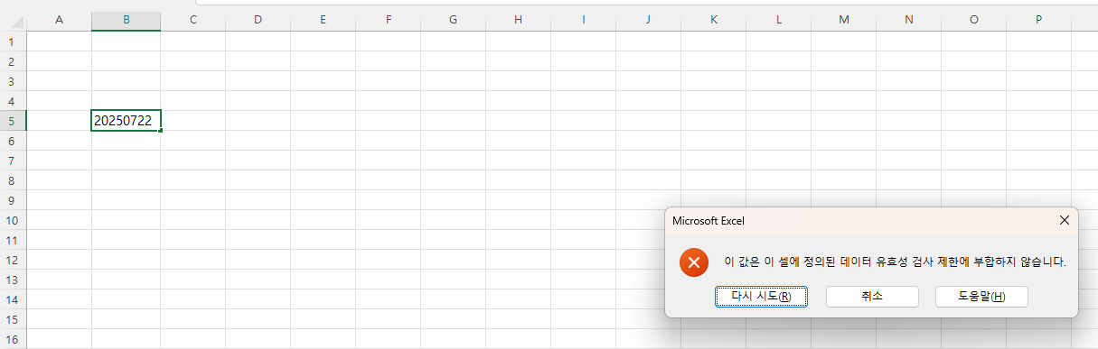 그럼 바로 오류창이 뜨면서 "이 값은 이 셀에 정의된 데이터 유효성 검사 제한에 부합하지 않습니다."라고 나옵니다.