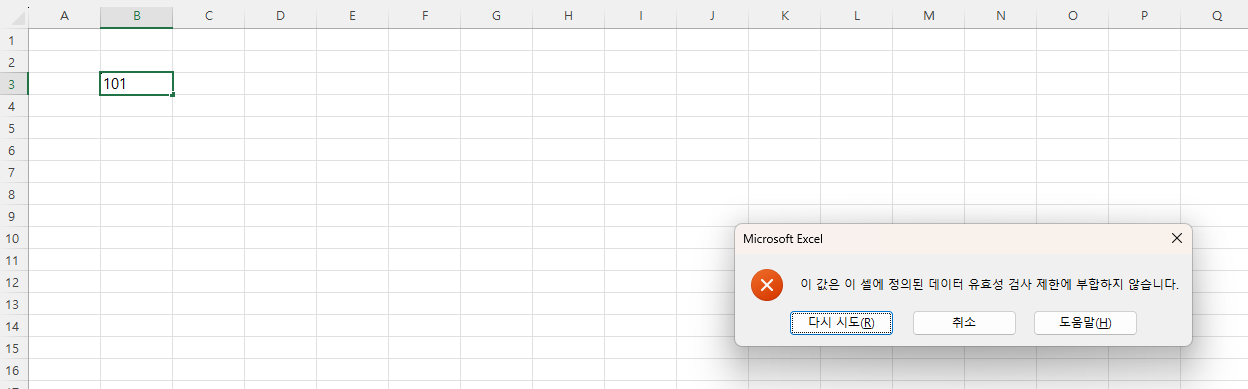 범위를 최솟값 1, 최댓값 100으로 설정한 다음 확인을 누르고 설정한 범위에 101을 입력해 보도록 하겠습니다.