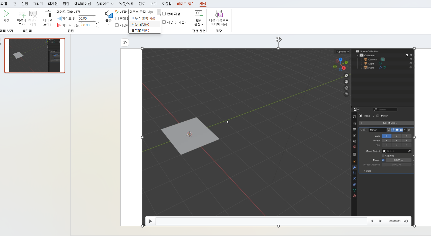 동영상을 넣은 슬라이드가 나왔을 때 영상을 자동으로 재생시키는 방법입니다.