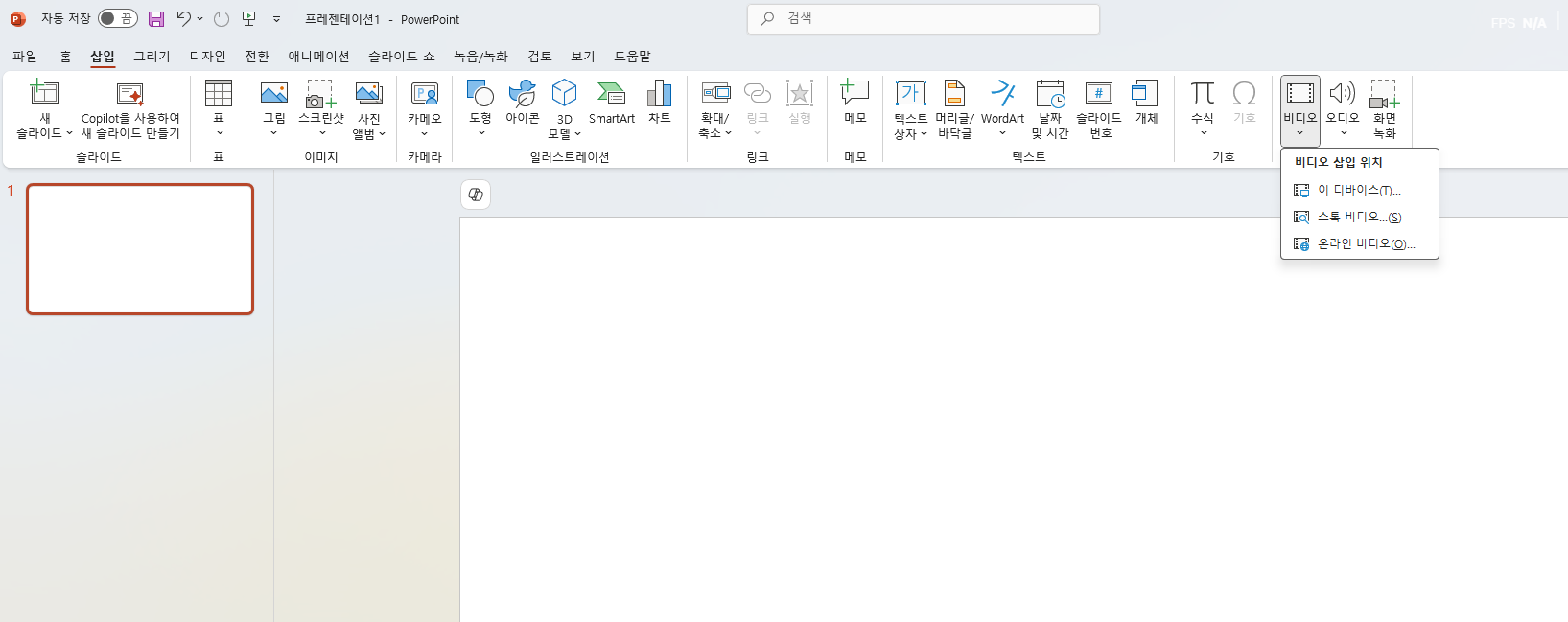 동영상을 추가할 슬라이드를 선택한 후에 [삽입] > [비디오]를 클릭한 다음 어떤 영상을 넣을지 선택해 주세요