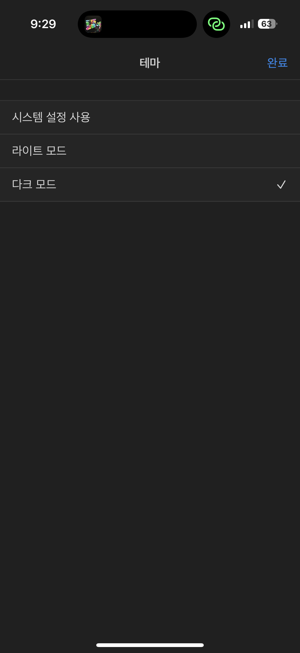'테마' > 시스템 설정 사용을 터치해 주세요 그럼 우측 이미지처럼 테마를 선택할 수 있습니다. 여기서 '다크 모드'를 선택하면