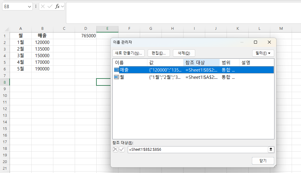 여기에서는 정의된 이름을 확인할 수 있고 수정과 삭제가 가능합니다.
