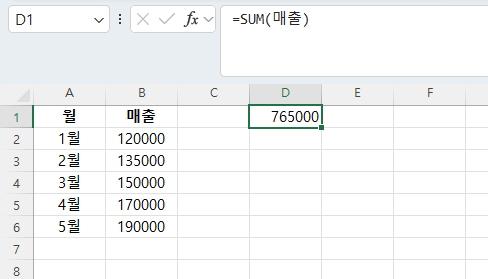 자 매출을 이름 적용한 다음 SUM 함수를 사용한 상태입니다. =SUM(매출)로 값이 출력되는 걸 확인할 수 있습니다.