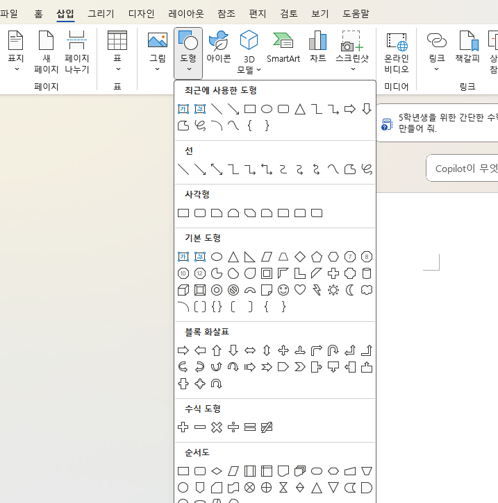 - 여기서 원하는 도형을 클릭한 뒤 마우스로 드래그하면 문서에 삽입됩니다.