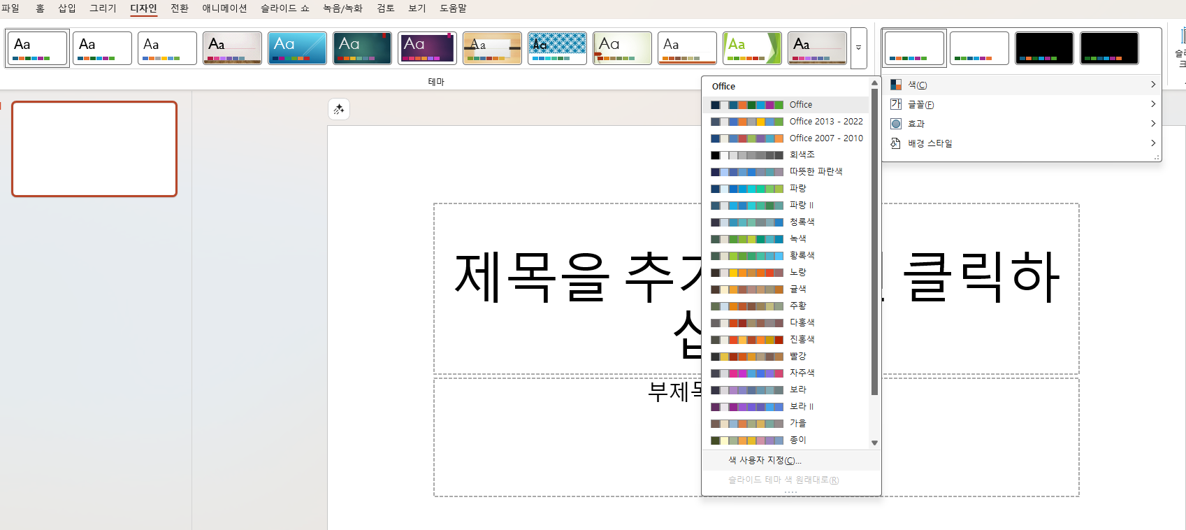 - 디자인 탭 > 색 > 사용자 지정을 클릭해 주세요