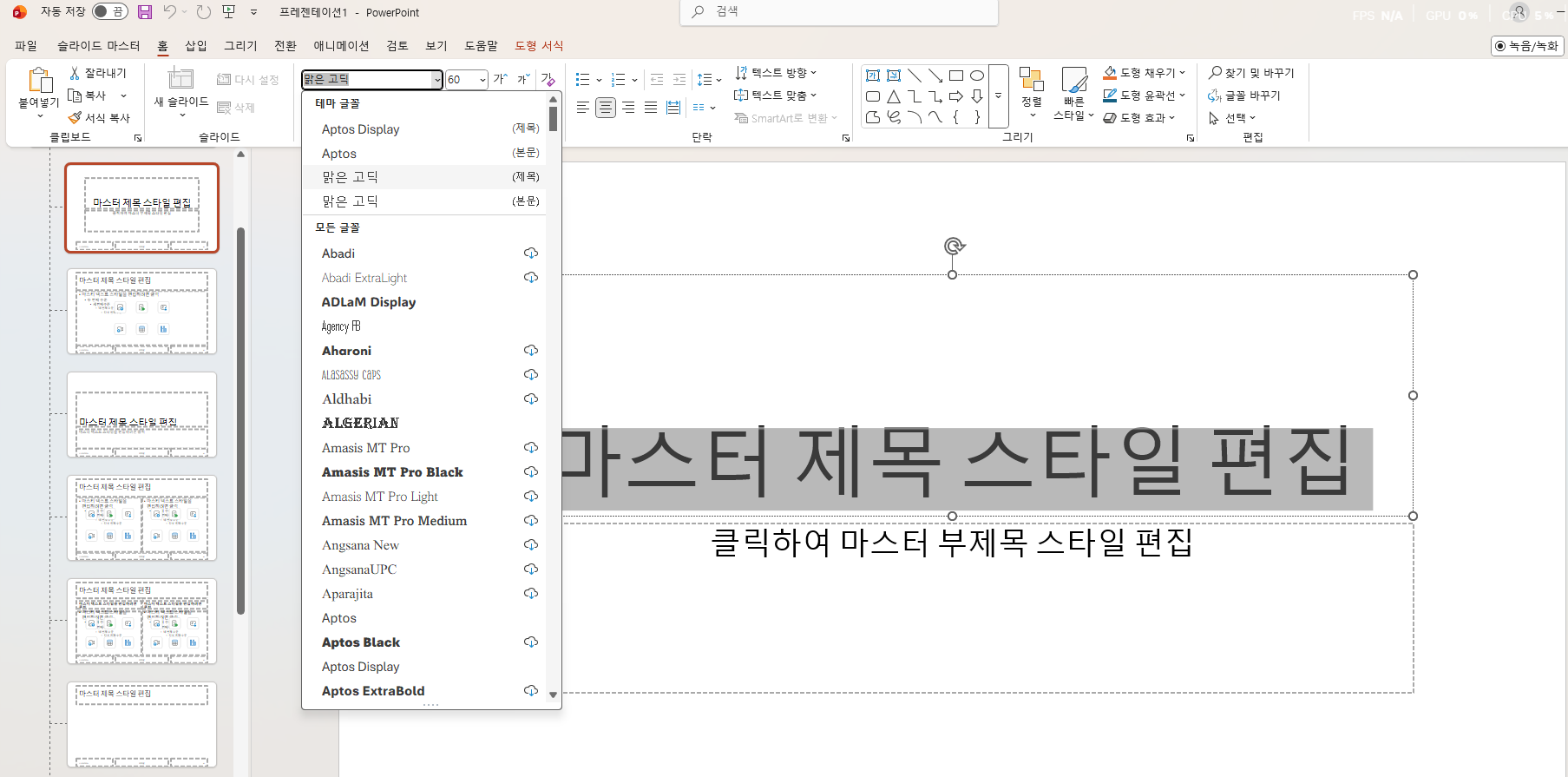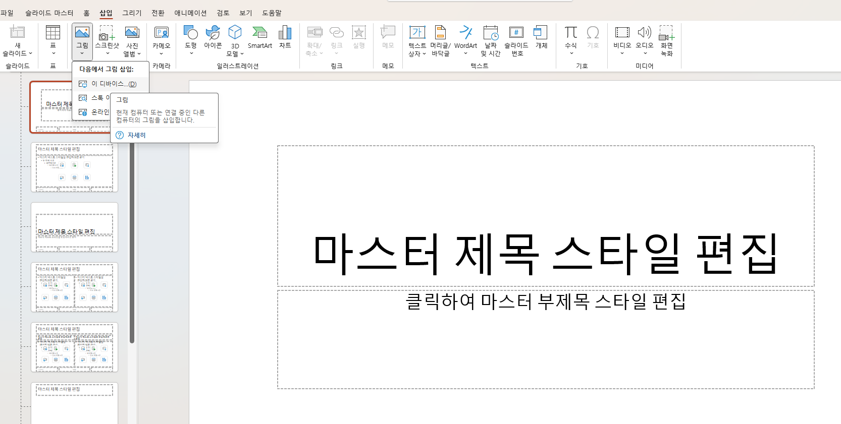 - 이 순간에 화면이 새롭게 바뀌면서 왼쪽 패널에 마스터 슬라이드 + 여러 레이아웃이 보이게 됩니다.