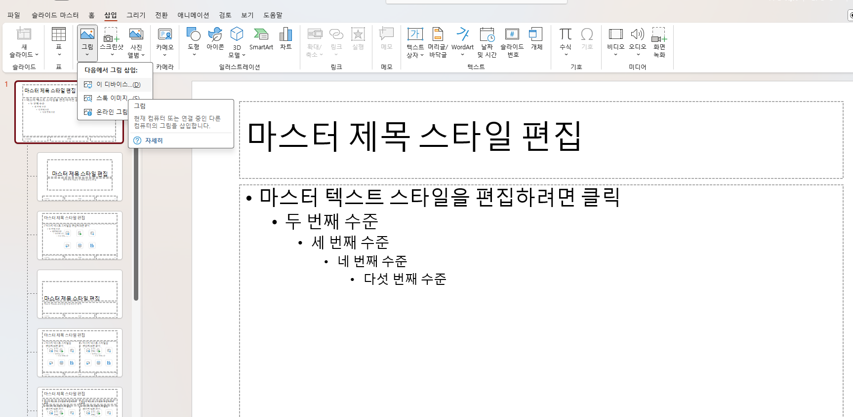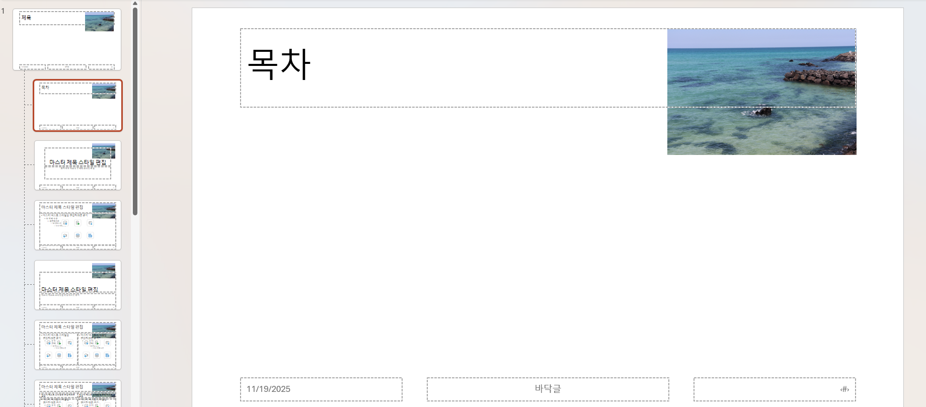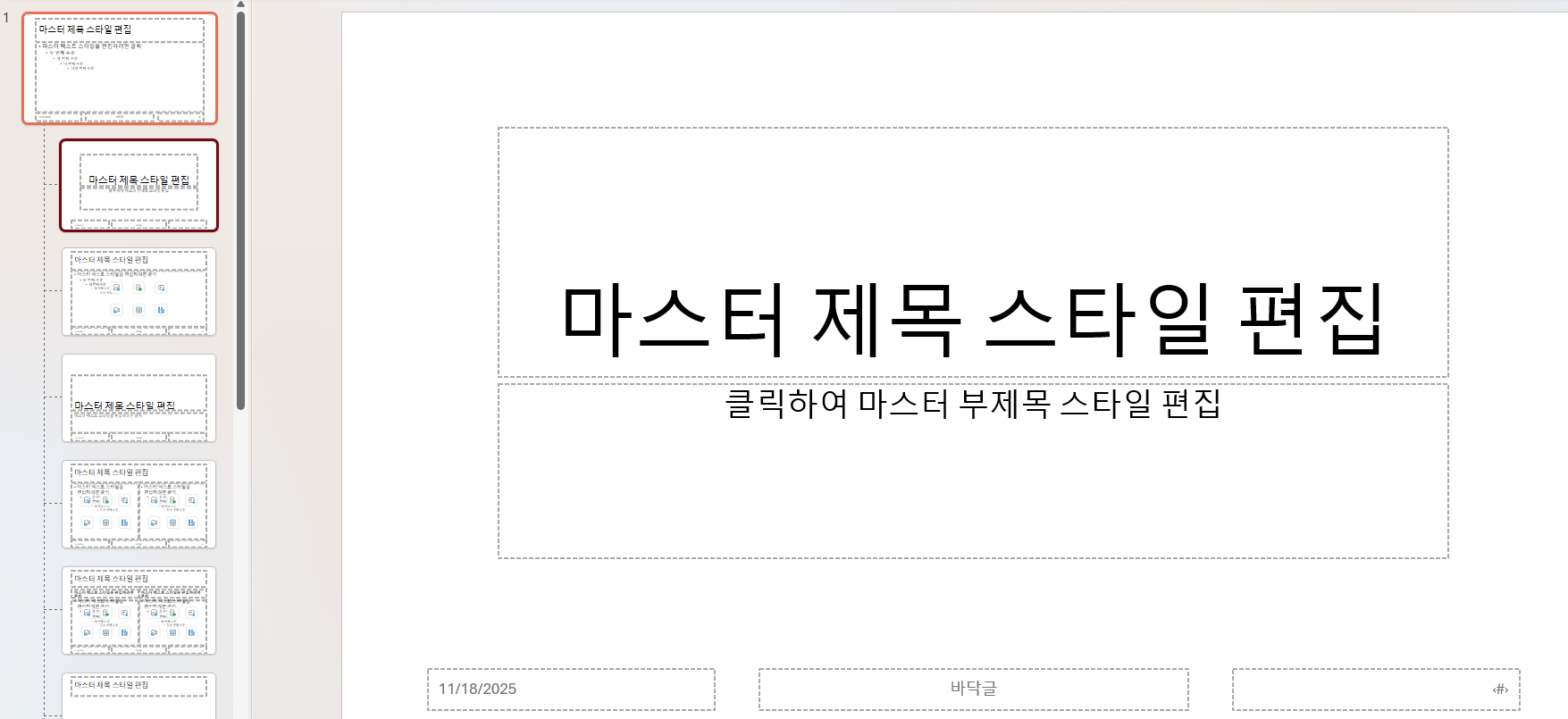 - 그 아래 제목 슬라이드, 목차 슬라이드, 본문 슬라이드 등 여러 '레이아웃 슬라이드'가 나열됩니다.