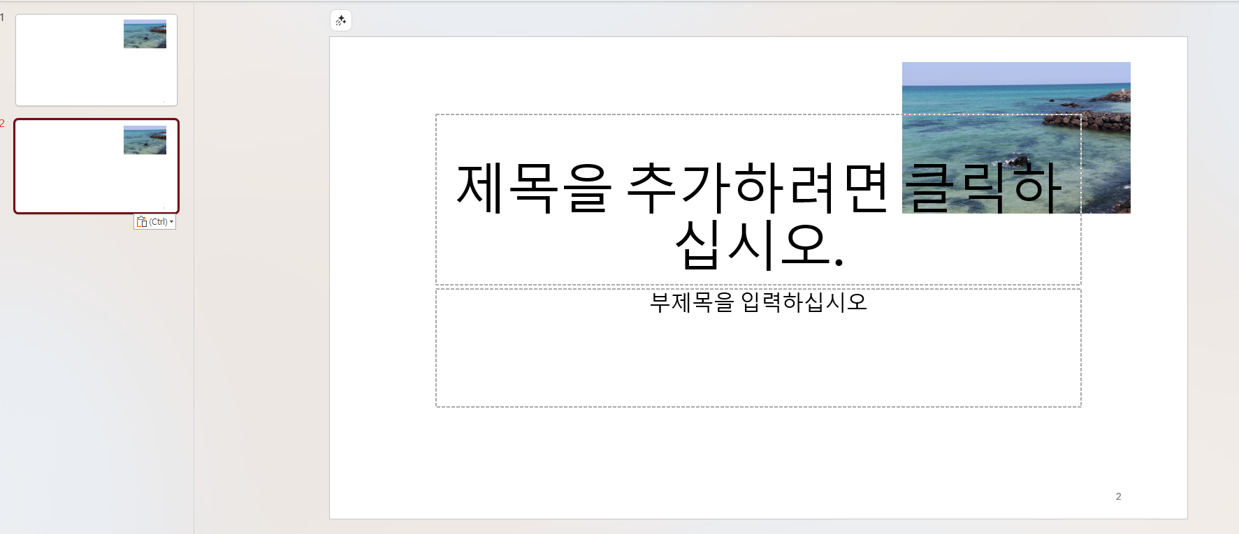 - 오른쪽 상단 모서리에 예시로 배치했습니다. 아래 이미지를 보면 모든 슬라이드에 적용된 게 보일 겁니다.