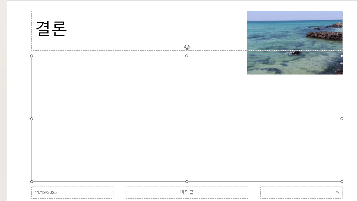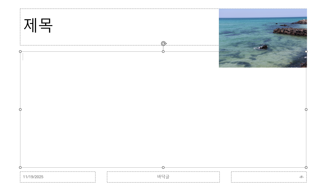 - 배경을 단색으로 두면 집중도가 올라가고 시각적 노이즈도 줄어듭니다. 템플릿을 여러 사람이 사용할 경우 제목 위치가 흔들리지 않도록 마스터에서 정확히 고정해 두는 것이 효과적입니다.