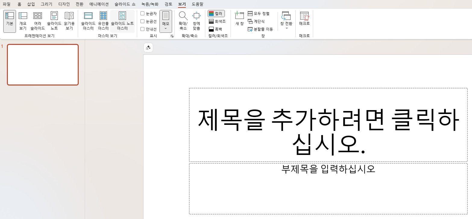 - 버튼을 클릭하면 화면이 일반 슬라이드 모드가 아니라 '마스터 편집 모드'로 변경됩니다.
