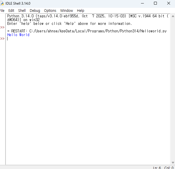 - IDLE 창 상단 메뉴를 보면 File, Edit, Format, Run 등의 메뉴가 보입니다.