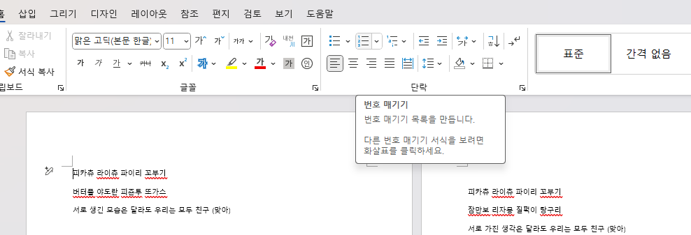 - 홈 탭 > 단락 > 번호 매기기 아이콘을 클릭합니다.