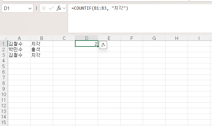 - B1:B3 범위에서 지각에 대한 값만 출력: 2