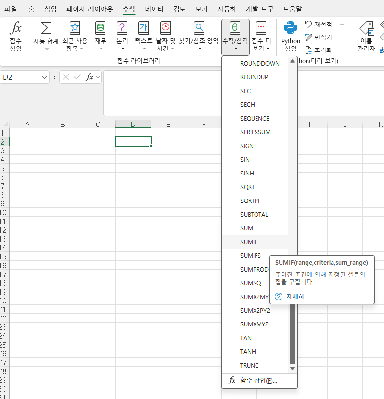 → “수학/삼각(Math & Trig)” 또는 “통계(Statistical)” 선택 - 목록에서 SUMIF 또는 COUNTIF 클릭